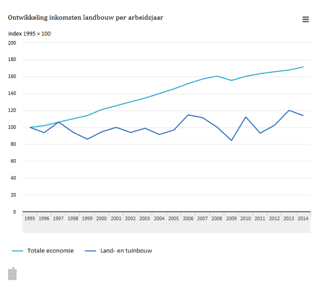 Daar steekt de ontwikkeling van de agrarische inkomsten sterk bij af. Ter illustratie: van 1995 tot en met 2014 stegen de inkomsten per arbeidsjaar in de totale Nederlandse economie vier keer harder dan in de agrarische sector. De agrarische inkomsten vertoonden in de laatste 19 jaar een grillig verloop, constateert CBS. In 2014 was dit bijna 14 procent hoger dan in 1995, waar de inkomsten van de totale economie 72 procent hoger lagen.