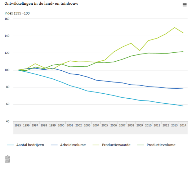 Het aantal agrarische bedrijven is in de afgelopen twintig jaar met 42 procent gedaald tot circa 65.000 bedrijven in 2014. In die periode is het zogeheten arbeidsvolume ook met 22 procent gedaald, maar nam de productie dus met eveneens 22 procent toe. Dit heeft alles te maken met de innovaties in de productiemethoden en de schaalvoordelen die grotere agrarische bedrijven met zich meebrengen, motiveert CBS. Een doorsnee agrarisch bedrijf in 2014 had bijvoorbeeld 62 procent meer grond dan in 1995.