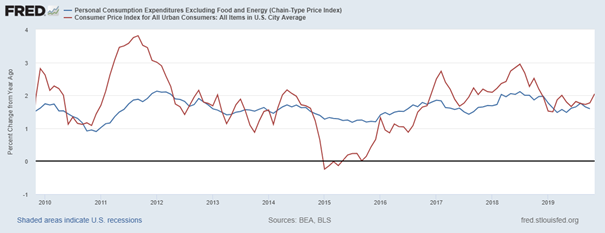 In de tweede plaats was daar de bewering van Powell dat de inflatie sinds hij in 2012 bij de Fed kwam, maar niet naar 2% wil stijgen. Als dat geen fake news is, dan weet ik het ook niet. In de grafiek hieronder is duidelijk te zien dat de inflatie, volgens zowel de gangbare CPI-maatstaf als de PCE-index die de voorkeur van de Fed heeft, sinds Powells komst bij de bank zeer regelmatig in de buurt of bóven de 2% lag.