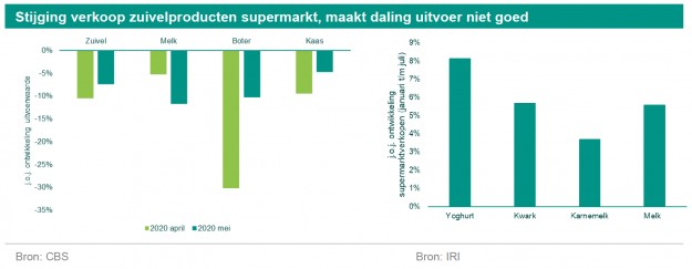 Ook de verkopen van zuivelproducten, zoals yoghurt, melk en toetjes zijn in supermarkten sterk toegenomen. Zo werd er 8% meer yoghurt verkocht en 6% meer melk. Zuivelspecialiteiten als toetjes stegen met 12% het snelst. Dit maakte de daling van de uitvoer van zuivel echter niet goed. Door de lockdown in voorname afzetlanden, plus gebrek aan koelcontainers in belangrijke havens in China, kreeg de uitvoerwaarde van zuivelproducten een knauw. De export van melkpoeder naar China nam bijvoorbeeld flink af.