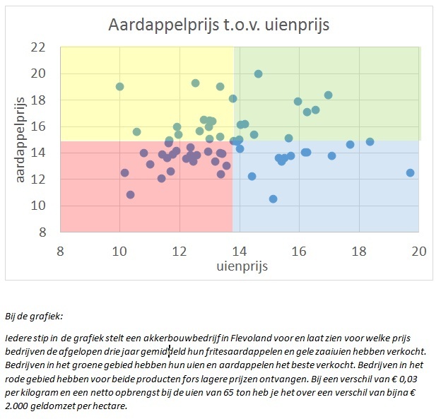 ‘Nee, zo zwart-wit is dat niet. Er zijn topondernemers bij die voor beide producten mooie prijzen krijgen, maar er zijn er net zoveel die met beide aan de onderkant zitten. Die laatste groep moet zich echt afvragen of zij wel een goede afzetstrategie hanteren. Er is om aan zowel aardappelen als uien goed te verdienen meer nodig dan goed kunnen verkopen. Er spelen andere mechanismes op de markten, het momentum van verkopen verschilt, er wordt anders gehandeld en de markten reageren anders. Als teler kun je de ene markt goed doorhebben en de andere niet. Of hij is meer gefocust op één.’