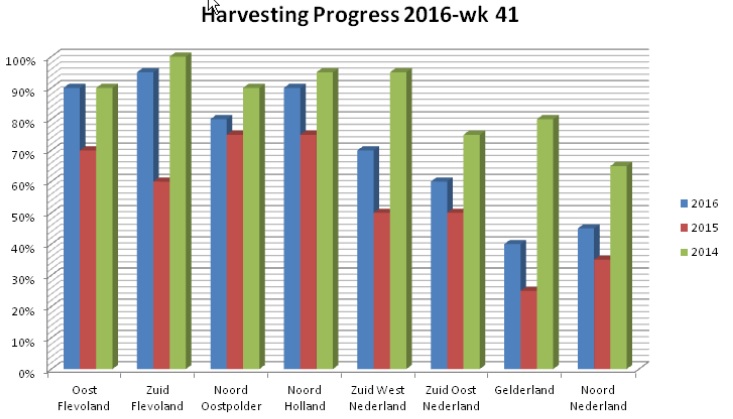 Geen enkele Nederlandse regio loopt achter op vorig jaar. Dat hebben we aan het voorspoedige herfstweer te danken. Ten opzichte van het droge 2014 hebben we nog wel veel goed te maken.