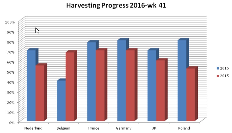 Met bijna 80 procent gerooid zijn Duitsland en Polen koploper van de EU6 aardappellanden. Frankrijk volgt en ligt daar net onder. Groot-Brittannië heeft bijna 70 procent achter de planken en is daarmee net zover gevorderd als in Nederland het geval is.