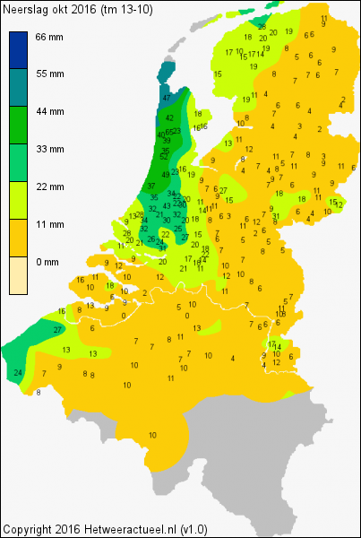 Het KNMI verwacht voor de lange termijn - tot het einde van deze maand - geen neerslag van betekenis. De temperatuur blijft schommelen rond normale waarde voor deze tijd van dit jaar. Ook voor België is dit het geval. De 0 mm is tot en met 28 oktober bijna overal waarneembaar. Na een warm weekend blijft het tussen de 11 en 14 graden celsius schommelen, met iets hogere nachttemperaturen tot 9 graden.