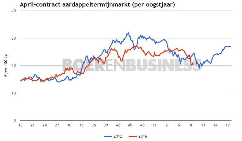 Het is hier al een aantal keren genoemd, maar de vergelijking met seizoen 2012 is frappant. Ook toen zakte de markt terug naar €19,50 in de periode feb./maart om overigens daarna weer flink op te lopen door een later voorjaar en aantrekkende vraag vanuit Engeland.