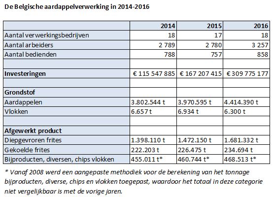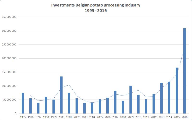 Daarnaast gaat 2016 de boeken in als het jaar waarin het meest werd geïnvesteerd sinds de start van de jaarlijkse waarnemingen in 1995. Met een investeringscijfer van 310 miljoen euro (85 procent ten opzichte van het vorige recordjaar, 2015) ziet de Belgische aardappelsector de toekomst rooskleurig in.