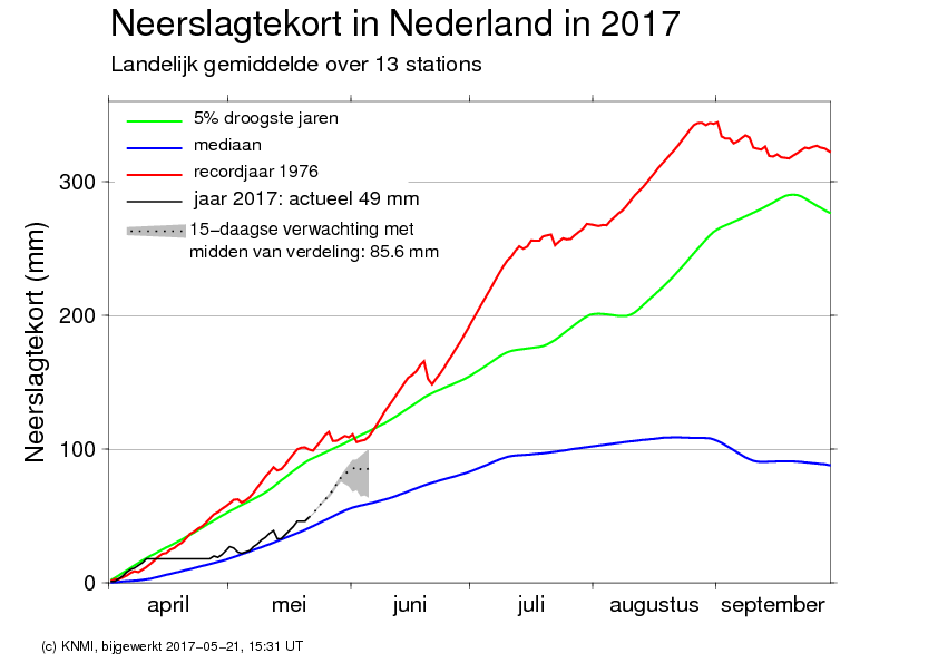 Hoewel er zondag 21 mei hier en daar nog wat regen viel, in Deventer was zelfs een wolkbreuk, is de kans op neerslag de komende week erg klein. Daarmee loopt het neerslagtekort in Nederland verder op. Volgens het KNMI is het neerslagtekort midden mei bovengemiddeld.