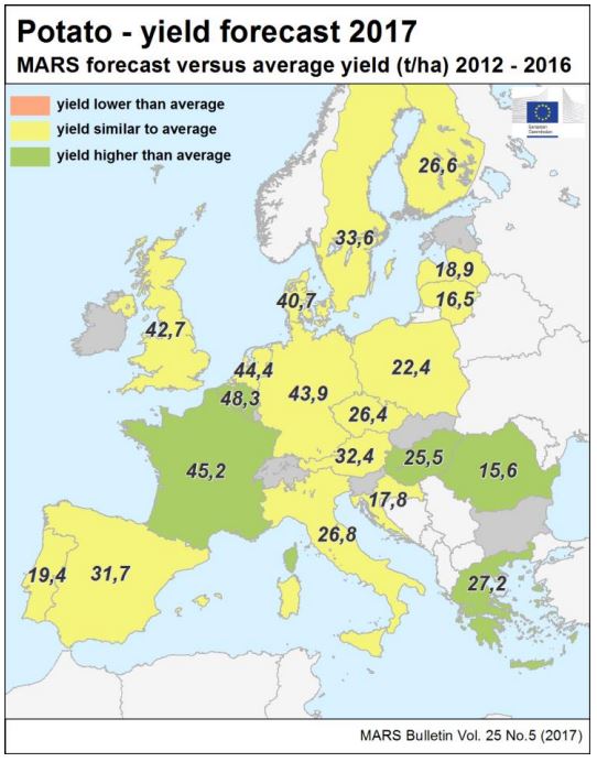 Met een oogstverwachting van 33.6 ton per hectare in 2017 worden er in de Europese Unie 2,4 procent meer aardappelen geproduceerd dan vorig jaar. Vooral België scoort beter, maar dat land werd in 2016 dan ook flink getroffen door wateroverlast.