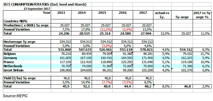 Een groter areaal en een hogere opbrengst, brengt de aardappeloogst van 2017 in de EU-5 boven het 5-jarig gemiddelde. Die prognose geeft de NEPG (North-western Europan Potato Growers) af op basis van proefrooiingen en praktijkresultaten uit het veld.