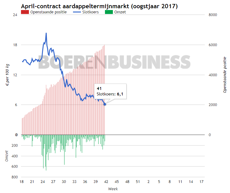 Dat de markt een verdere neerwaartse beweging maakt wordt vooral veroorzaakt door de melding van hogere opbrengsten dan verwacht. Daarnaast is er vanuit koperszijde geen enkele interesse om vrije partijen te kopen. De markt ligt volledig op zijn gat en het enige wat telers rest bij het zoeken van kopers is het alternatieve circuit of door opslag te huren.