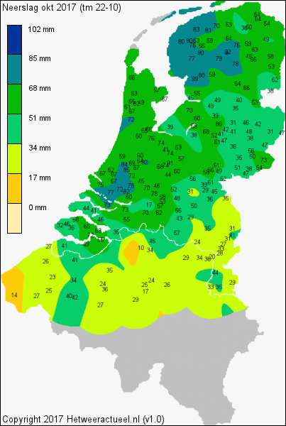 Deze week wordt wisselvallig weer opgegeven. Met de neerslag valt het mee. Echter, na de regen van afgelopen week duurt het even voor de machines terug het land op kunnen. Vooral in Friesland is het erg nat. Tegen en in de Noordoostpolder bracht oktober tot dusver al 100 millimeter regen. Ook in Oost-Flevoland is het nat. In het zuidwesten is het iets beter. Opvallend blijft dat Oost-Brabant en Limburg de regen bespaart blijven. Daar vordert het rooien dan ook vlot. In het zuidwesten kan eveneens weer gerooid worden op plekken.
