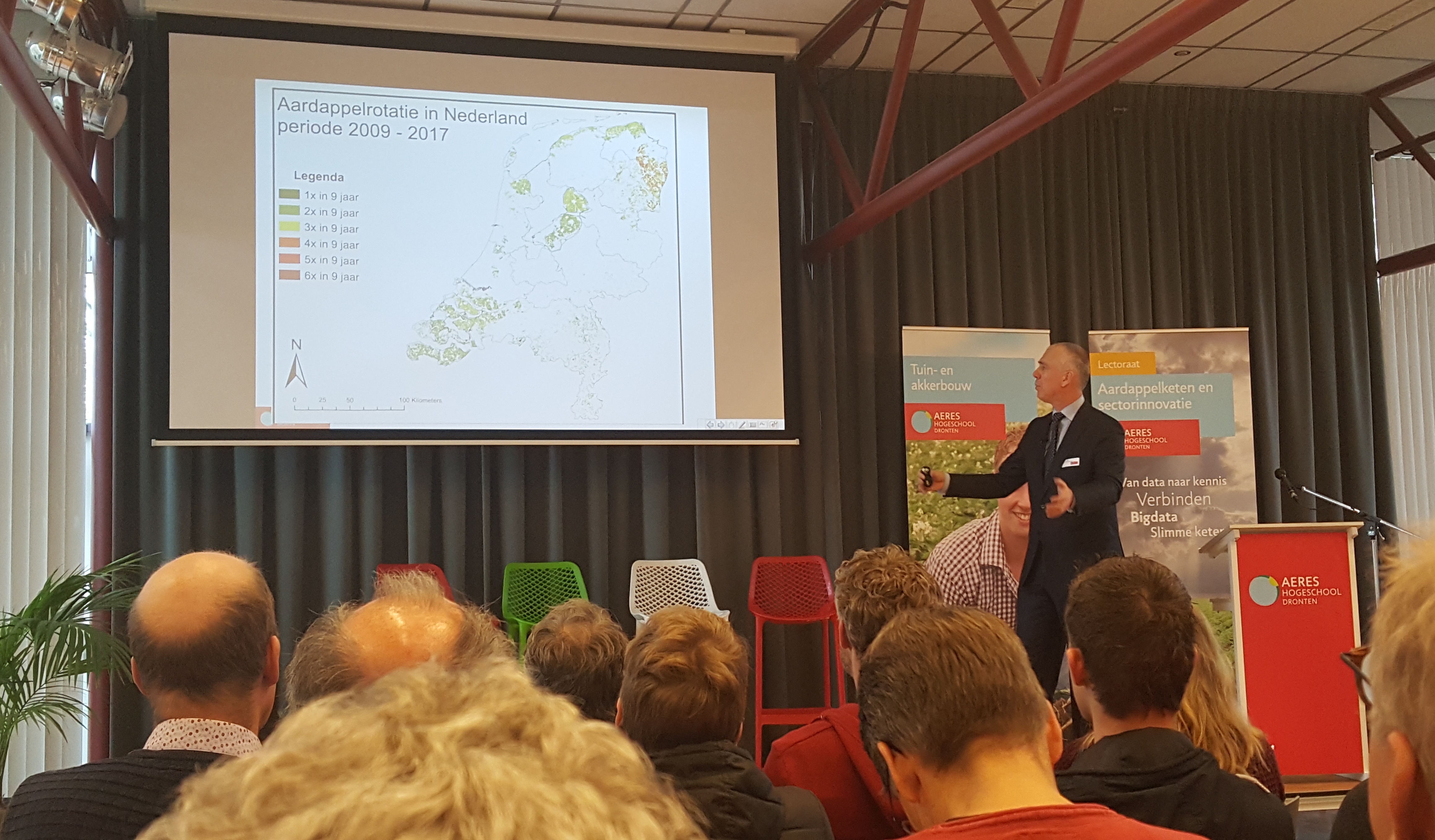 De lector pakt er nog meer cijfers bij. De hoeveelheid akkerbouwgrond is sinds 2000 met 20% verminderd. "Het aardappelareaal blijft gelijk, maar de beschikbare grondoppervlakte neemt af en de gemiddelde rotatie bedraagt de laatste jaren rond de 30%. Dat betekent dat ieder jaar 30% van de het akkerbouwareaal vol met aardappelen staat; daarmee is de gemiddelde rotatie 1 op 3. Het is verbazend hoe nauw de rotaties zijn en dit neigt nog nauwer te worden. Dit jaar groeide dat al door naar een dichtheid van 32%. Ik noem dat telen op het randje."