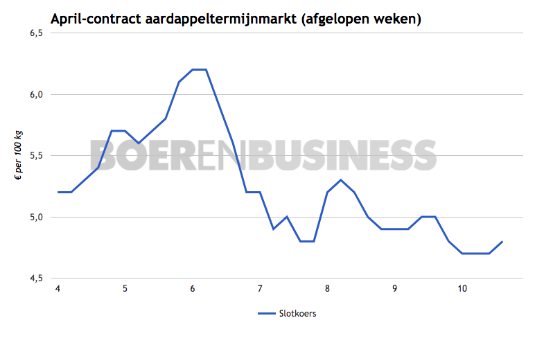 Ook zou er Innovator zijn verhandeld voor €5,25 per 100 kilo (levering april), voor directe levering zou €5 worden geboden. Voor Fontane en Challenger (levering maart) zou €4 worden geboden. Reka noteerde voor week 10 €0,25 hoger (bandbreedte €3,50 tot €4,25).