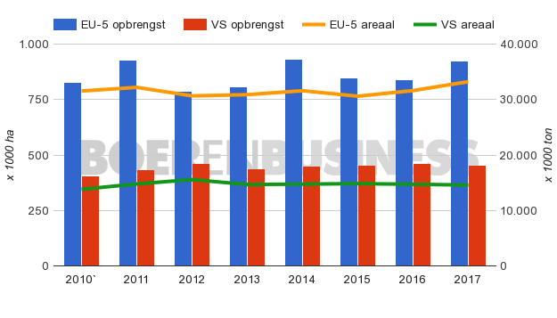 Het areaal 'autumn potatoes' (de hoofdoogst van de fritesaardappelen) bedraagt zo’n 365.000 hectare. Dat is fors minder dan de 830.600 hectare in de EU-5. Daarbij oogstten de Amerikanen in 2017 zo’n 18 miljoen ton aardappelen, tegenover circa 30 miljoen ton voor de EU-5 (25 miljoen ton in oogstjaar 2016).