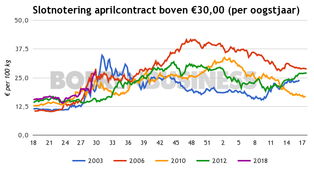 In de afgelopen 18 jaar is de aardappeltermijnmarkt 4 keer boven het niveau van €30 gekomen. In 2006 bereikte het aprilcontract een niveau van €35 en zelfs kortstondig €40. In 2003 bleef het bij €34,75 steken. Vooral 2003 is vergelijkbaar met de huidige situatie. In de overige 3 jaren kwam de prijspiek later, toen in het bewaarseizoen werd gehandeld.