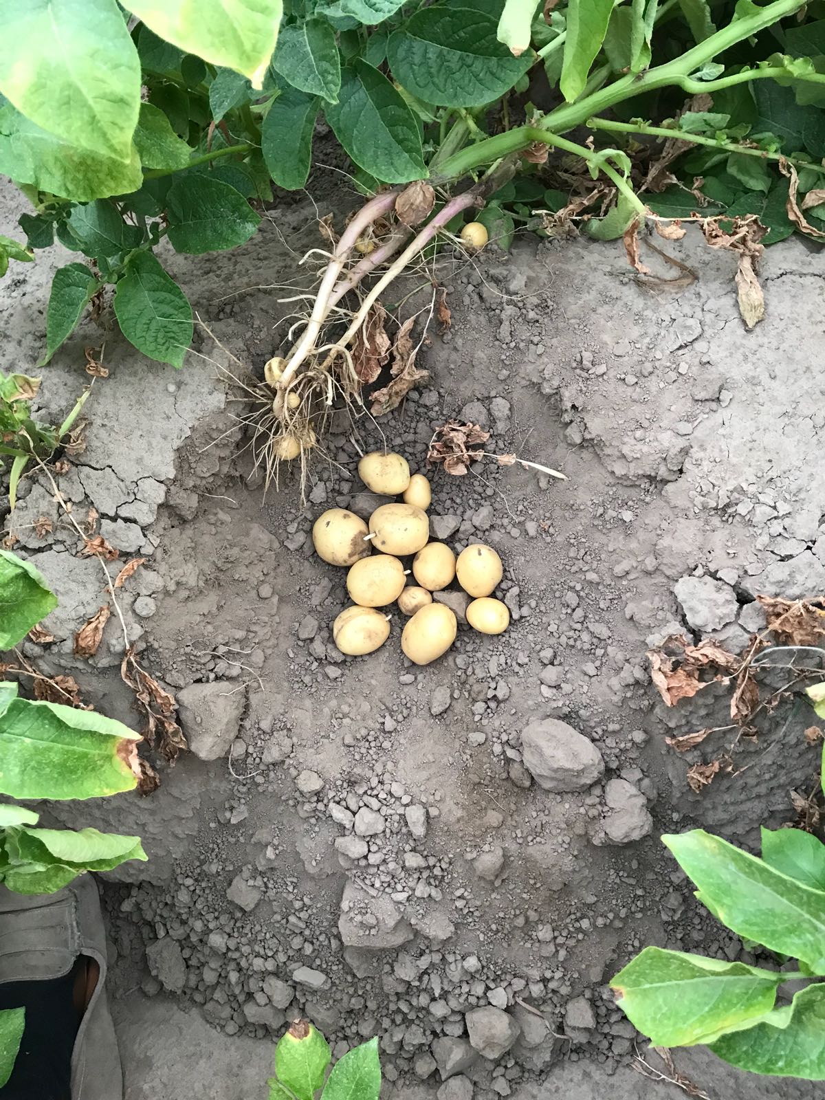 De opbrengsten van een aardappelplant in Vlaanderen (eind juli).