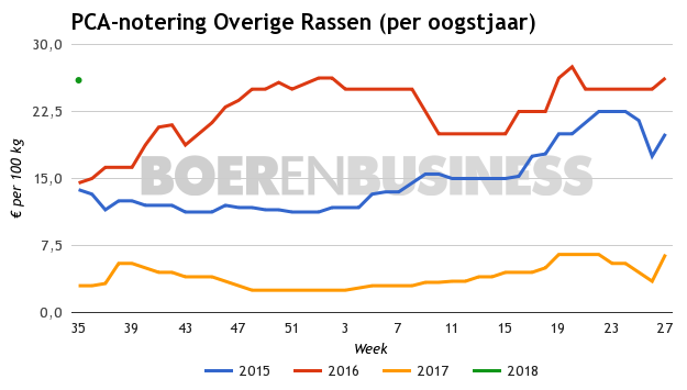 PCA noteerde voor Fontane oude oogst in week 32 nog een prijs van €27,50 per 100 kilo. De start van het nieuwe seizoen ligt bijna €10 hoger dan de oude hoogste prijs. In week 34 van 2015 werd €17,50 voor Fontane genoteerd. Het 3-jarig gemiddelde bedraagt hier €12,66 per 100 kilo, waarmee de huidige af land prijs 105% hoger ligt.