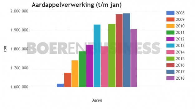 De aardappelverwerking over de periode februari 2018 tot en met januari 2019 komt echter niet boven de 4 miljoen ton aardappelen uit. Dat cijfer werd in dezelfde periode vorig jaar wel gehaald.