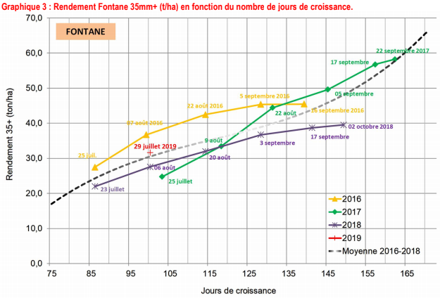 De monsters van de Fontane's komen gemiddeld uit op 33 ton per hectare (bruto). Opvallend is dat Vlaanderen het met 38 ton per hectare gemiddeld beter doet dan Wallonië, waar de Fontane’s niet verder komen dan 27 ton per hectare. Daarmee is het gemiddelde 20% hoger dan in de voorgaande 4 jaren. Het meerjarig gemiddelde is 27,5 ton per hectare. Het percentage 50 millimeter opwaarts is met 50% gemiddeld, net zoals een onderwatergewicht van 385. Het knolaantal ligt iets lager.