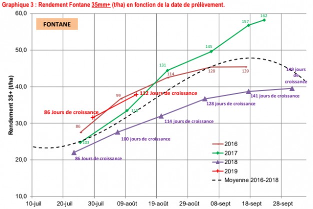 De netto-opbrengst van alle maten komt op 40 ton per hectare bij Fontane. De 11 percelen in Wallonië zitten op 34 ton per hectare en de 17 van Vlaanderen op 43 ton per hectare. Het 4-jarig gemiddelde bedraagt 36 ton per hectare, waarbij moet worden opgemerkt dat in de voorgaande jaren iets vroeger is bemonsterd.