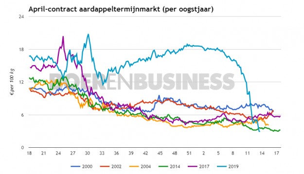 Bijzondere tijden geven bijzondere ontwikkelingen. In week 14 ging de aardappeltermijnmarkt naar het laagste punt van de afgelopen 20 jaar. Nog nooit was de termijnmarkt in deze week zo laag. De sector breekt zijn hoofd over hoe de situatie moet (of kan) worden opgelost.