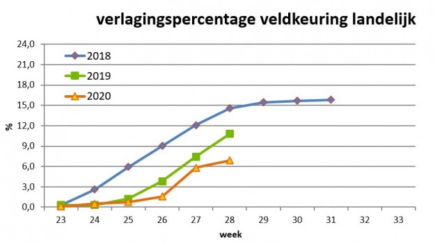 De resultaten van de veldkeuringen van keuringsdienst NAK laten een iets positiever beeld zien dan eerder deze maand. De stijging van het verlagingspercentage vlakt iets af.