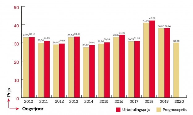 De prognoseprijs 2020 is weliswaar flink lager dan de 2 jaren ervoor (2018 en 2019), maar ligt min of meer in lijn met de jaren daarvoor. "Vorig jaar had de coronacrisis nog nauwelijks invloed. Dit jaar is dat anders en dat zien we terug in de prijs", zo laat Martin Jansen Klomp, regional manager Benelux van HZPC, in een verklaring weten. "Als we kijken naar de prijsontwikkeling van de afgelopen 10 jaar en de huidige omstandigheden, dan zijn we tevreden mer de prognoseprijs van €30,00 per 100 kilo."