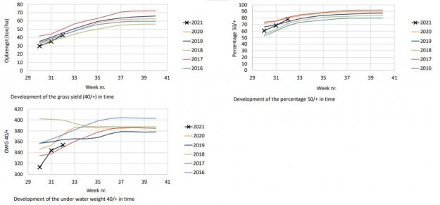 In Nederland lijkt de situatie redelijk vergelijkbaar met die in België. Uit de proefrooiing van Aviko blijkt de totale opbrengst rond het langjarige gemiddelde zit, maar dat de sortering hier wel wat grover is. Ook in Nederland blijft het gemiddelde OWG onder de industrienorm van 360 gram.