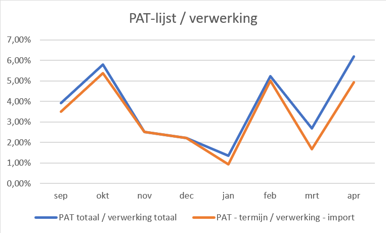 Als je de inbreng op de PAT naast de verwerkingscijfers van de VAVI legt, ontstaat toch wel een ander beeld over de vrije markt dan het kwart vrije aardappelen waar in de sector nogal eens mee wordt gerekend. Over hoe je dat vaststelt kun je discussiëren, maar - of je nu het totaal op de PAT deelt door het totale verwerkingscijfer of dat je de op termijn gekochte aardappelen op de PAT niet meeneemt en het aandeel geïmporteerde aardappelen in mindering brengt op het verwerkingscijfer - het percentage vrije aardappelen is de afgelopen maanden zelden boven de 5% uitgekomen. Uitschieter naar beneden was januari waar de PAT-inbreng ongeveer 1% van de verwerking uitmaakte.