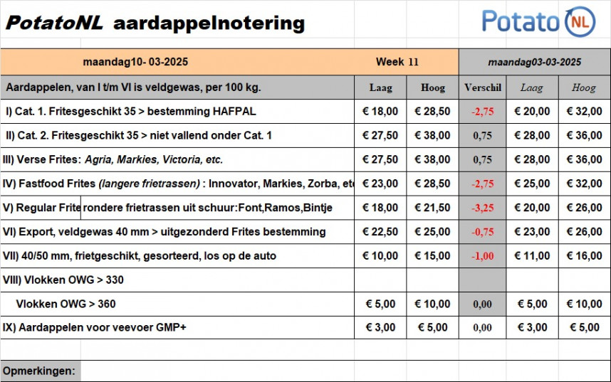 PotatoNL was er laat bij dit seizoen en heeft besloten een geheel eigen koers te varen. Dat de Nederlandse noteringen altijd iets hoger in de boom zitten dan bij bijvoorbeeld onze zuiderburen, zoveel is wel duidelijk. Maar dit jaar zijn de verschillen wel heel erg groot. Ook in de DCA EU-4 Potato Index is dat goed zichtbaar. Voor week 11 blijft PotatoNL afwijken van de lijn in de landen om ons heen.