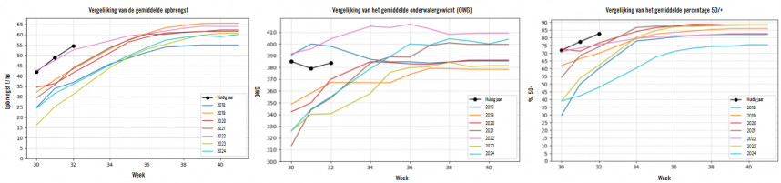 De gemiddelde bruto-opbrengst in de proefrooiing van aardappelen voor de verwerking van Aviko komt uit op circa 55 ton per hectare. Daarmee is de opbrengst zo vroeg in het seizoen ongekend hoog. Helemaal onlogisch is dat niet als we bedenken dat veel aardappelen dit seizoen vroeg gepoot zijn. Meer dan 80% van de aardappelen zit in de maat 50 op. Daarmee zijn de aardappelen veel grover dan andere jaren in deze week.