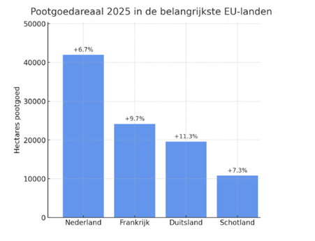 Deze geluiden gingen afgelopen week rond op de Potato Europe in Lelystad. Volgens de Franse brancheorganisatie FN3PT is het areaal in de zes belangrijkste Europese pootgoedlanden, Nederland, Frankrijk, Duitsland, Schotland, Denemarken en België, in 2025 met 9,5% toegenomen tot 106.864 hectare. In Nederland steeg het areaal met 6,7% tot 41.948 hectare, in Frankrijk met 9,7% tot 24.157 hectare, in Duitsland met 11,3% tot 19.575 hectare en in Schotland met 7,3% tot 10.829 hectare.