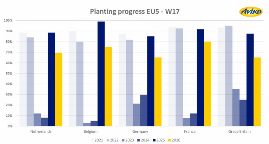 Waar het plantseizoen vlak na Pasen (week 15) nog aarzelend begon, is in twee weken tijd al een groot deel van het areaal ingepland. Daarmee positioneert 2026 zich als een vlot seizoen wat het poten betreft. Vorig jaar en in 2021 en 2022 kenden een zeer vroege start; dit jaar volgt snel.
