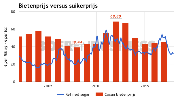 Als basisprijs hanteert de coöperatie een bedrag van €32,50. Als we de verhalen mogen geloven, dan komt het resultaat voor de oogst van 2018 daar niet veel boven. Over oogst 2017 werd een ledentoeslag van €14,75 uitgekeerd. Bij presentatie van de jaarcijfers gaf De Lugt aan dat hij voor 2018 een bietenprijs van €40 per ton verwachtte.