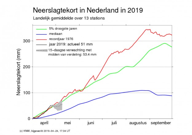 Aan het begin van 2019 is weinig neerslag gevallen, wat extra zwaar weegt na de droogte van 2018. Het landelijke neerslagtekort komt momenteel al uit op 47 millimeter. Dat is meer dan in recordjaar 1976. Toch is er bij de waterbeheerders nog geen sprake van paniek, omdat de neerslagkansen vanaf deze week weer toenemen.