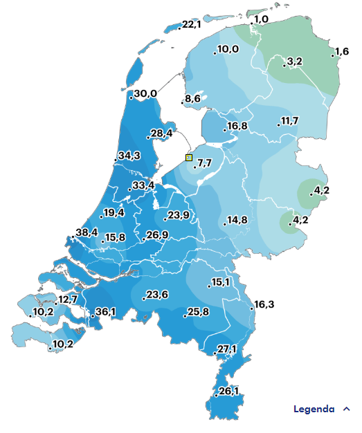 In het westen van Nederland is afgelopen nacht behoorlijk wat neerslag gevallen. De provincie Noord-Holland kreeg de grootste hoeveelheden te verwerken, want daar viel op sommige plekken ruim 30 millimeter. Ook in de provincies Zuid-Holland, Noord-Brabant en Limburg viel er gemiddeld meer dan 20 millimeter.