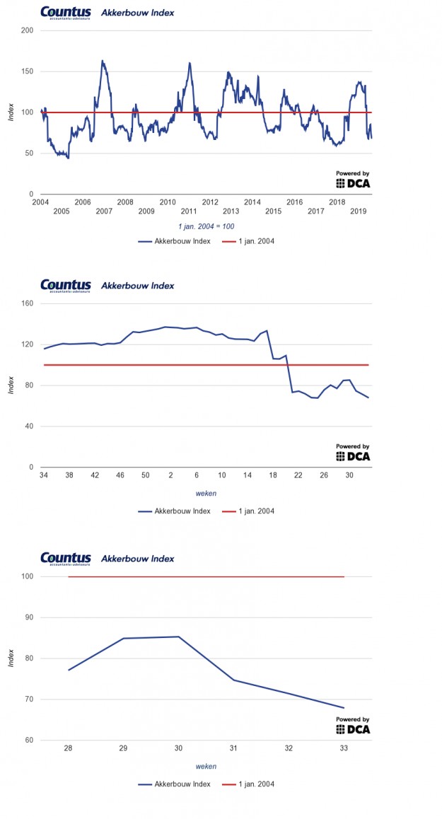 In de overgangsweek tussen juli en augustus (week 31) kwam de Countus Akkerbouwindex uit op een niveau van 74,7 punten. Niet eerder in de voorbije 5 jaar stond de akkerbouwbarometer op zo’n laag niveau in deze periode van het jaar; alleen in startjaar 2004 stond de Index (met 57,3 punten) nog veel lager.