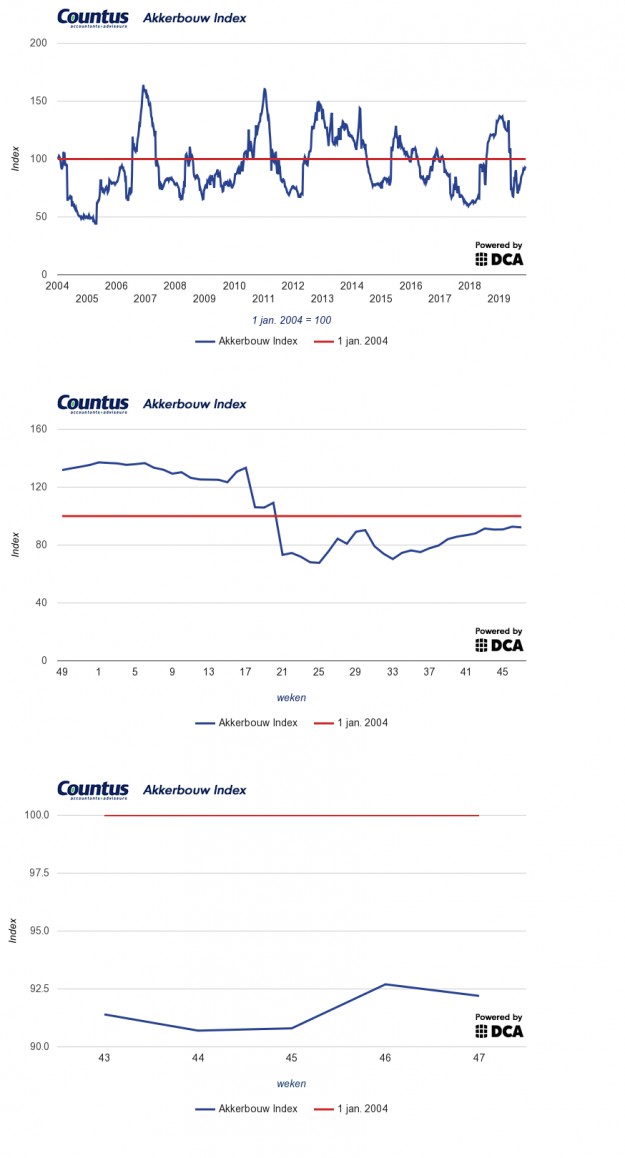 Dit resultaat staat in schril contrast tot vorig najaar. Toen werd eind november een indexcijfer van 132,4 punten genoteerd. Het 5-jarig gemiddelde van de Akkerbouwindex ligt op 98,28 punten, waarna deze in de laatste weken van het jaar meestal licht afneemt. Het is de vraag of 2019 dit beeld gaat spiegelen.