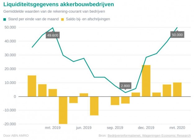Dit zegt ABN Amro in haar liquiditeitsmonitor voor de akkerbouw over het eerste kwartaal van dit jaar, waarin de bank samenwerkt met Wageningen UR en het ministerie van Landbouw. In de eerste 3 maanden van dit jaar is er met de liquiditeit van de akkerbouw nog weinig aan de hand, ondanks dat de coronacrisis zich in de loop van maart in alle hevigheid ontvouwde. De stand op de lopende rekening van een gemiddeld akkerbouwbedrijf was met €50.000 aan het einde van het eerste kwartaal vrijwel identiek aan de stand van zaken in 2019.