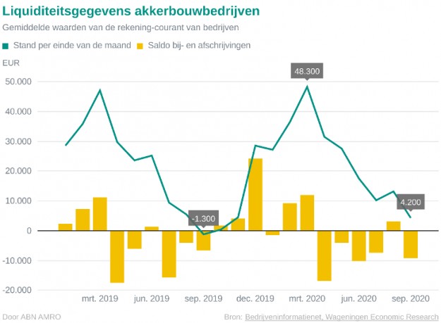 Akkerbouwbedrijven ondervinden nog steeds de gevolgen van de coronacrisis, zo toont de liquiditeitsmonitor van ABN Amro aan. De gemiddelde stand op de lopende rekening is richting het einde van het derde kwartaal gedaald naar €4.000. Dit is nog altijd €1.300 meer dan vorig jaar in dezelfde periode.