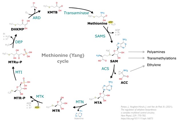 In de plant wordt ethyleen via een aantal stappen gesynthetiseerd uit het aminozuur methionine. Een belangrijk tussenproduct tijdens de vorming van ethyleen is ACC (1-aminocyclopropaan-1-carbonzuur). ACC is de verbinding die door het EFE enzym (Ethylene Forming Enzyme) wordt omgezet naar ethyleen (C2H4).