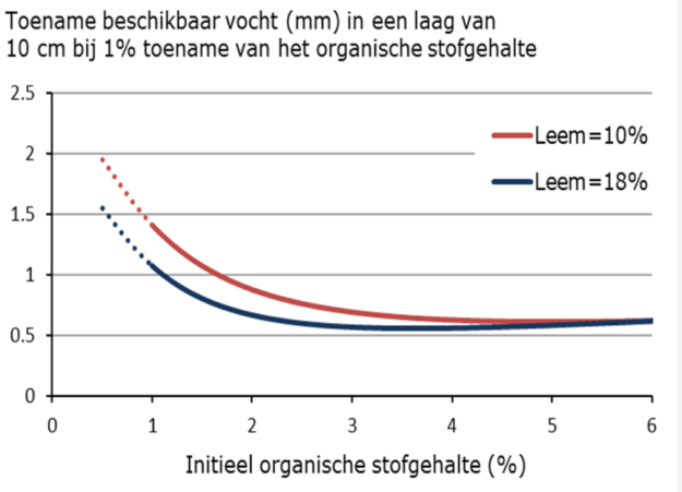 Verhogen van het gehalte organische stof verhoogt de beschikbaarheid van vocht, vooral op lichte gronden is de winst groot (bron: Deltafact maart 2021, Stichting Toegepast Onderzoek Waterbeheer)