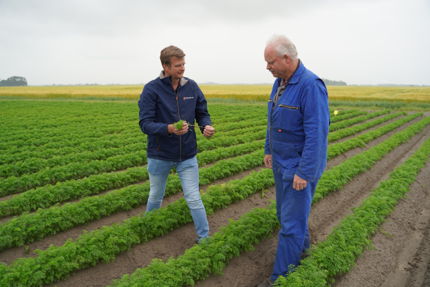 De peen staat er prachtig op, constateren Nico Walstra (links) en adviseur Jan Klaas de Graaf. Het 6,5 hectare grote perceel dat pal langs de Waddenkust staat (ras: Nerac) is 14 mei gezaaid, direct na bui van 30 millimeter. Kort daarna viel er nog eens 13 millimeter. "Alles is boven gekomen. 80 tot 100 planten per strekkende meter halen we hier met gemak'', stelt Walstra.