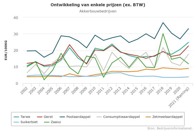 De aardappelen van de oogst 2021 zullen naar verwachting meer opbrengen in vergelijking met een jaar eerder. De afzet en prijsvorming van oogsten van 2019 en 2020 verliep moeizaam door corona. Hoewel corona nog niet weg is, verwachten het CBS en de WUR een duidelijke prijsstijging voor de oogst 2021. Daarbij moet wel worden opgemerkt worden dat de contractprijzen iets lager liggen dan een jaar eerder. Op de granenmarkt zijn de hogere prijzen vooral veroorzaakt door een kleinere oogst in een aantal grote graanlanden en een zeer goede mondiale vraag naar onder meer tarwe. Ook voor suiker gaat de WUR uit van een prijsstijging, vooral door gestegen prijzen op de wereldmarkt.