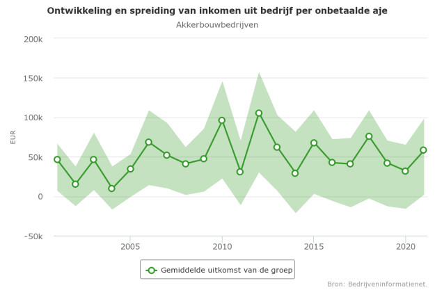 Het geraamde inkomen in de akkerbouw is per onbetaalde arbeidsjaareenheid (aje) is met ruim €25.000 gestegen. Het gemiddelde jaarinkomen per onbetaalde aje komt daarmee uit op €58.000. Er zijn daarbij wel grote verschillen tussen de bedrijven. Ruim 20% van de bedrijven haalt een inkomen dat onder of op de €2.000 blijft. Aan de andere kant van het spectrum is een even grote groep van bedrijven die een inkomen per onbetaalde arbeidsjaareenheid haalt van €98.000 of meer. Ook de netto kasstroompositie is verbeterd ten opzichte van vorig jaar. Bij 64% van de akkerbouwbedrijven kwam er voldoende geld binnen om aan de betalingsverplichtingen inclusief aflossingen te voldoen. Dat is 7% hoger in vergelijking met een jaar eerder. De rentabiliteit ligt gemiddeld op €95 opbrengsten per €100 kosten.