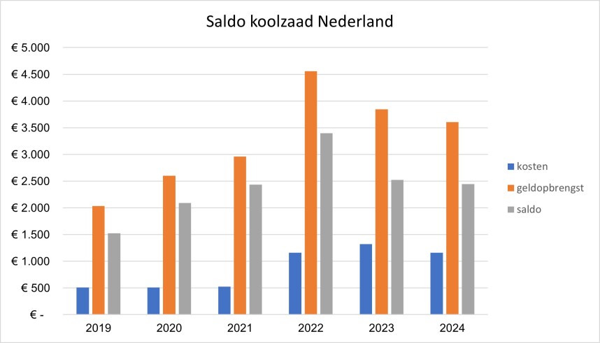 Afgelopen jaren lag het saldo van de teelt van virusresistente koolzaadrassen tussen de €2.000 en €2.500 per hectare. Ook voor 2022 wordt een saldo verwacht dat we decennialang niet meer gezien hebben. Dat is het resultaat van een combinatie van het aantal zonuren en de historische prijzen. De teeltkosten voor koolzaad zijn wel toegenomen, maar door de gunstige prijsontwikkeling blijft koolzaad ook naar de toekomst toe een goede keuze in het bouwplan.