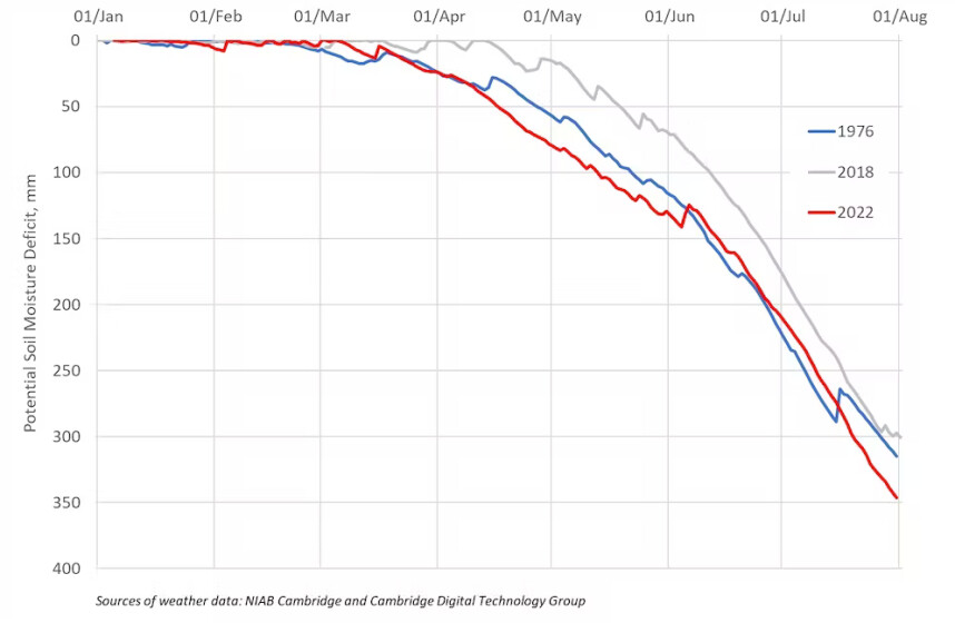 Zowel 1976 als 2022 waren heet – tot dusver althans. Eerstgenoemde telde maar liefst 16 aaneengesloten dagen met temperaturen boven de 30 graden. Het record lag op 35,6 graden. Dat record werd 19 juli verbroken met een temperatuur van 40,3 graden in Oost-Engeland. Nooit eerder werd zo'n hoge temperatuur door het Met Office gemeten op het eiland. Het gemiddelde voor heel juli bedraagt 23,5 graden en dat is 2,3 graden meer dan gemiddeld.