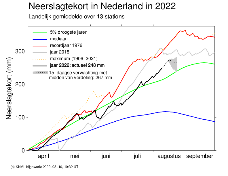 De verschillen per regio zijn de afgelopen week groter geworden. Het zuidoosten en noorden van Nederland hebben afgelopen week nog van een klein buitje mogen genieten, maar in de rest van Nederland viel *(weer) niets. Volgens de droogtemonitor van het KNMI is het gemiddeld landelijk neerslagtekort inmiddels 244 millimeter en loopt deze met de huidige weersverwachting op tot 267 millimeter de komende 15 dagen. Dat is nog altijd ruim 50 millimeter minder dan recordjaar 1976 op dit moment. Ook 2018 blijft voorlopig uit de buurt, die rond deze tijd net onder de 300 millimeter neerslagtekort schommelde. Het grote verschil met 2018 is dat die zomer al vroeg en veel zeer warme dagen kende. Dit jaar valt dat in vergelijking met 2018 nog mee.
