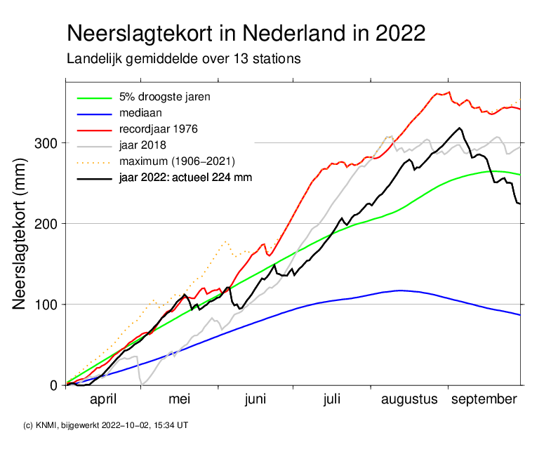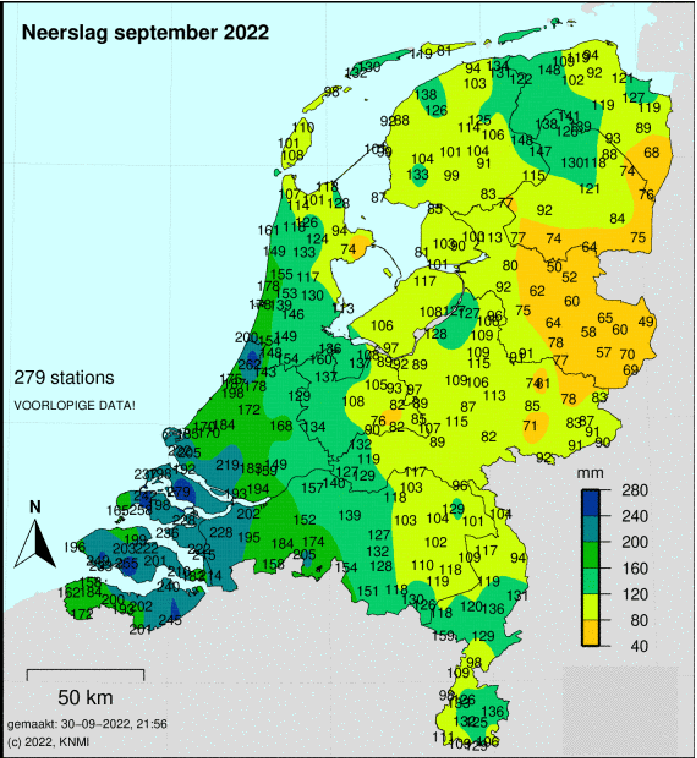 Door de vele neerslag in september is het neerslagtekort gezakt tot onder de 5 % droogste jaren. Dit komt echter te laat in het seizoen, nu de uien en veel aardappelpercelen klaar zijn met groeien. Het neerslagtekort stond eind september op 224 mm, dat was aan het begin van die maand bijna 100 millimeter meer.
