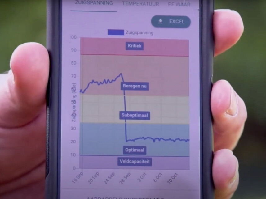 Arjan de Graaf heeft inmiddels drie teeltseizoenen ervaring met de bodemvochtsensoren. "Terwijl je met de trekker op het land zit, kun je gewoon zien hoe het met het bodemvocht gesteld is in je aardappelen op je telefoon. Op de pagina op de app zie je precies wat de toestand in de bodem is, met een duidelijk beregeningsadvies in kleur daaraan gekoppeld. Op basis daarvan kun je zelf je actie beslissen."